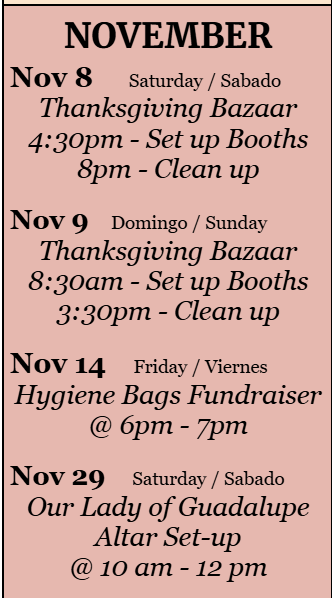 Primera Comunion Jovenes Grados 9-12: Los jovenes en preparatoria preparandose para la comunion, pueden tambien prepararse para la confirmacion. La formacion comenzara en el otoño y haran su primera comunion en la primavera, y la confirmacion en otra fecha cuando cumpla los requisitos. El sacramento requiere participacion activa de padres, y requiere asistencia de misa cada fin de semana.